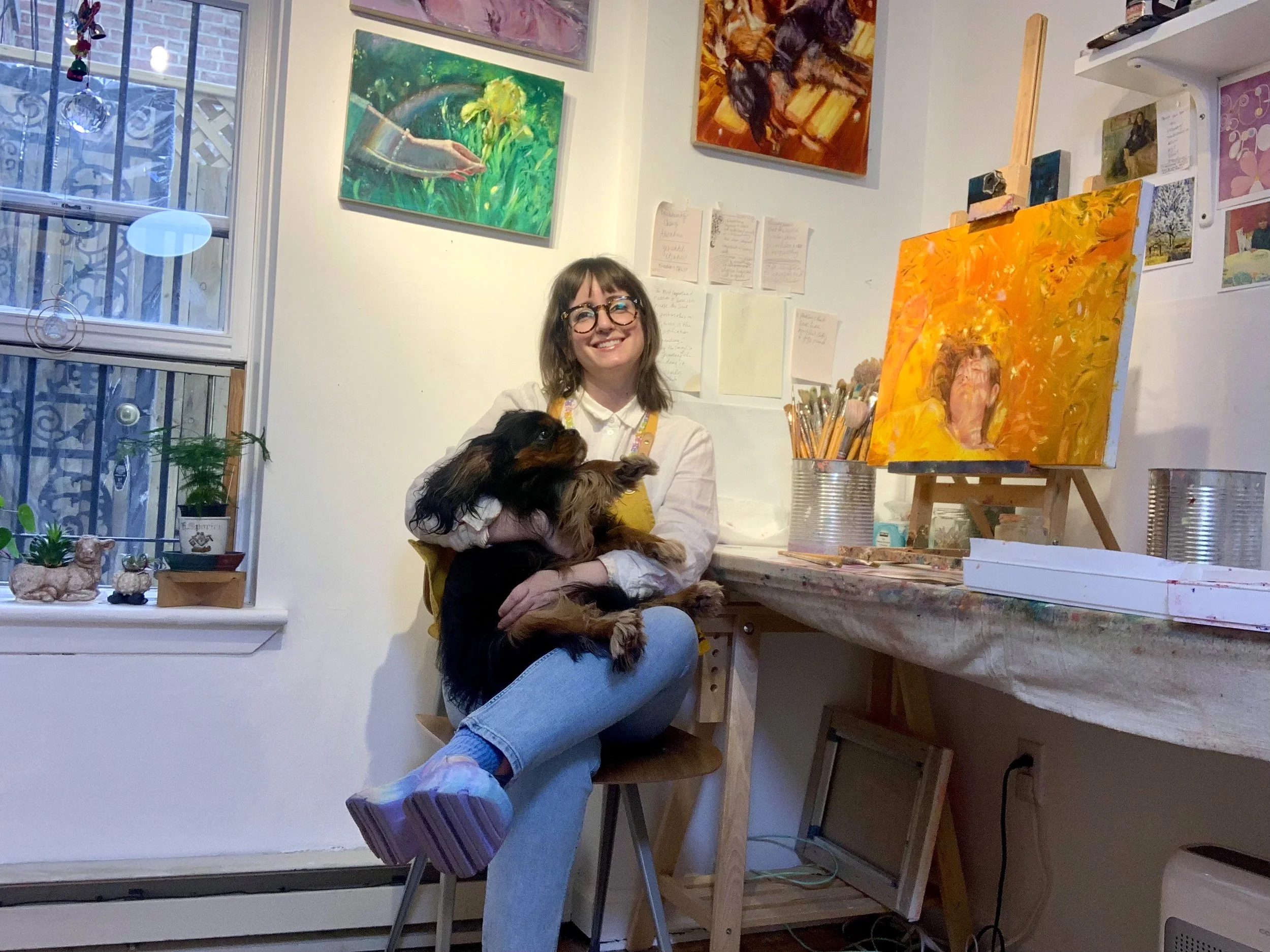 I primarily paint small scale domestic scenes in oil on linen, often including myself and those I cherish in quiet reflective moments. These works are shaped by the rhythms of my everyday life with my husband and our dogs, and increasingly by the natural world and the way its beauty sustains me both emotionally and spiritually. Experiences like sharing a meal, drawing together, or taking a nap with the pups unfold in an atmosphere of iridescent golden light, highlighting the passage of time while also nodding to many art historical influences including Pierre Bonnard, Edouard Vuillard, and Edvard Munch.